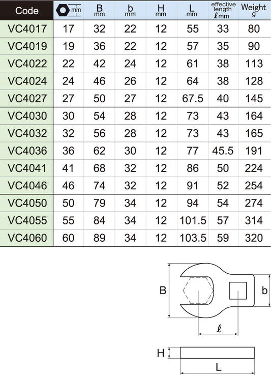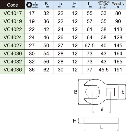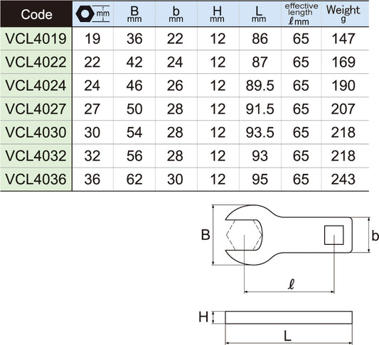 VCL4 [1/2"SQDR] Crowfoot Wrench Long type 19 - 36 mm ( 7 sizes available)