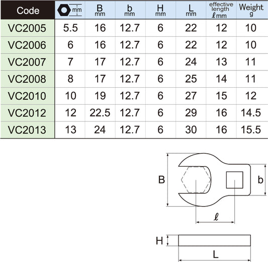 VC2 [1/4"SQDR]Crowfoot Wrench 5 - 13 mm (7 sizes available)